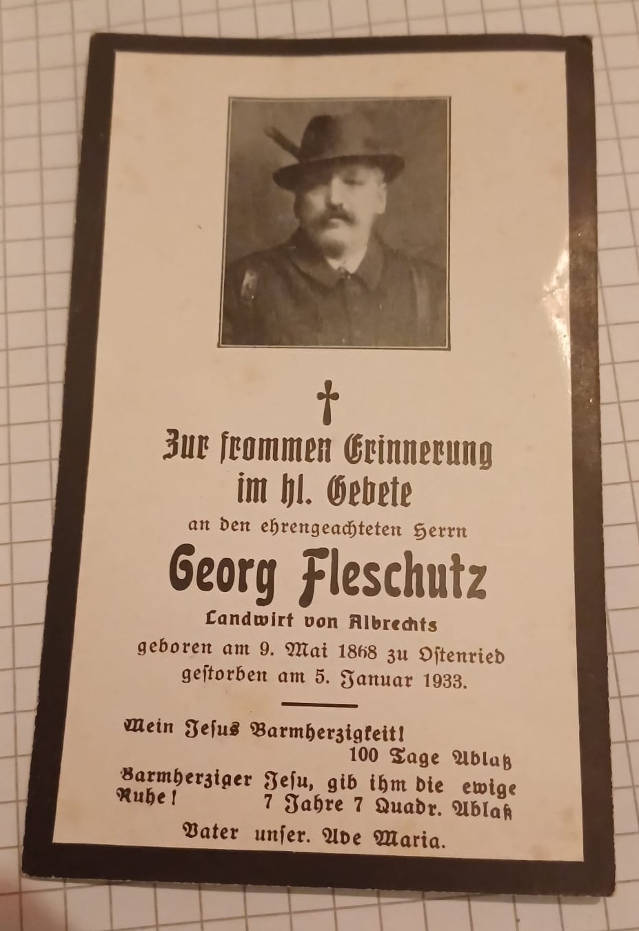 | Johann Georg | 09.05.1868 in Ostenried 71 bei Untrasried 🔨Bauer †05.01.1933 {Sterbebild} ⚭ Apollonia Mayr (09.02.1870 +08.12.1957 {Sterbebild}) |