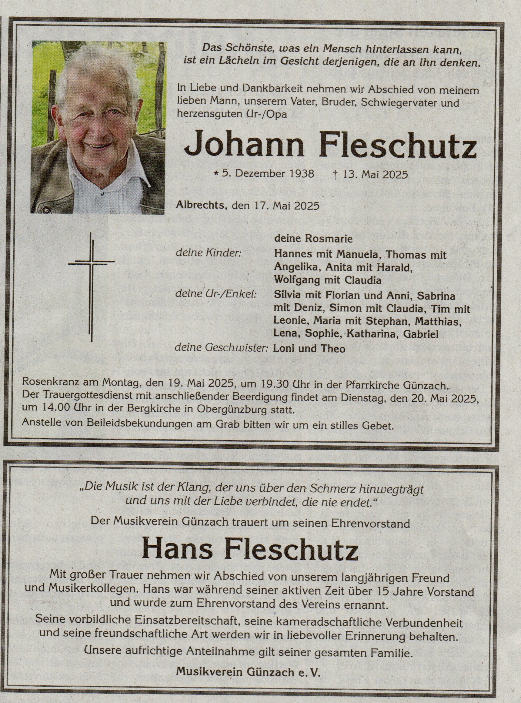 | Johann ‘Hans’ | *05.12.1938 in A. †13.05.2025 in A. 🛠Bauer ⚭ Rosmarie Höbel *18.12.1947 {Todesanzeige} |